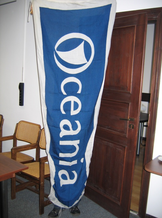 Była też sprawa wimpla. Jacek wymyślił, że OCEANIA powinna mieć wimpel - czyli taki proporzec - flagę rozpoznawczą, która w czasie podniesienia bandery zostanie wciągnięta na środkowy maszt – na grot.